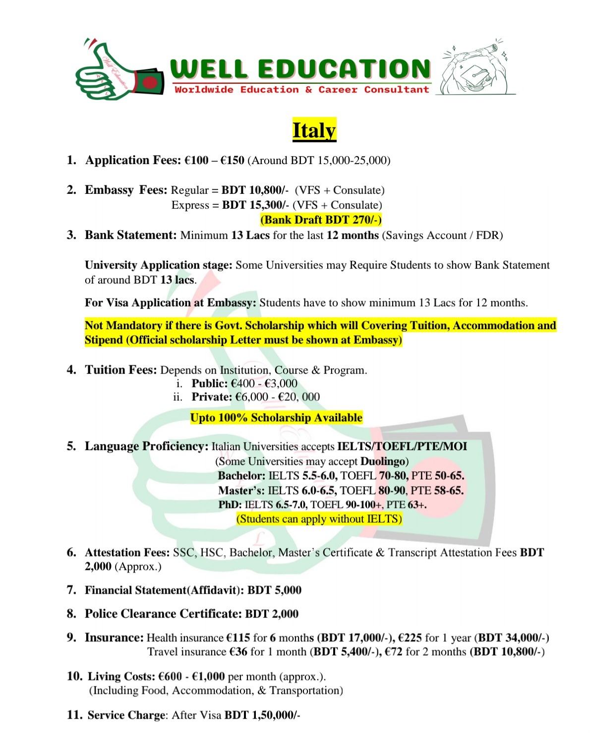 Health insurance €225 (for 1 year, Schengen-approved)